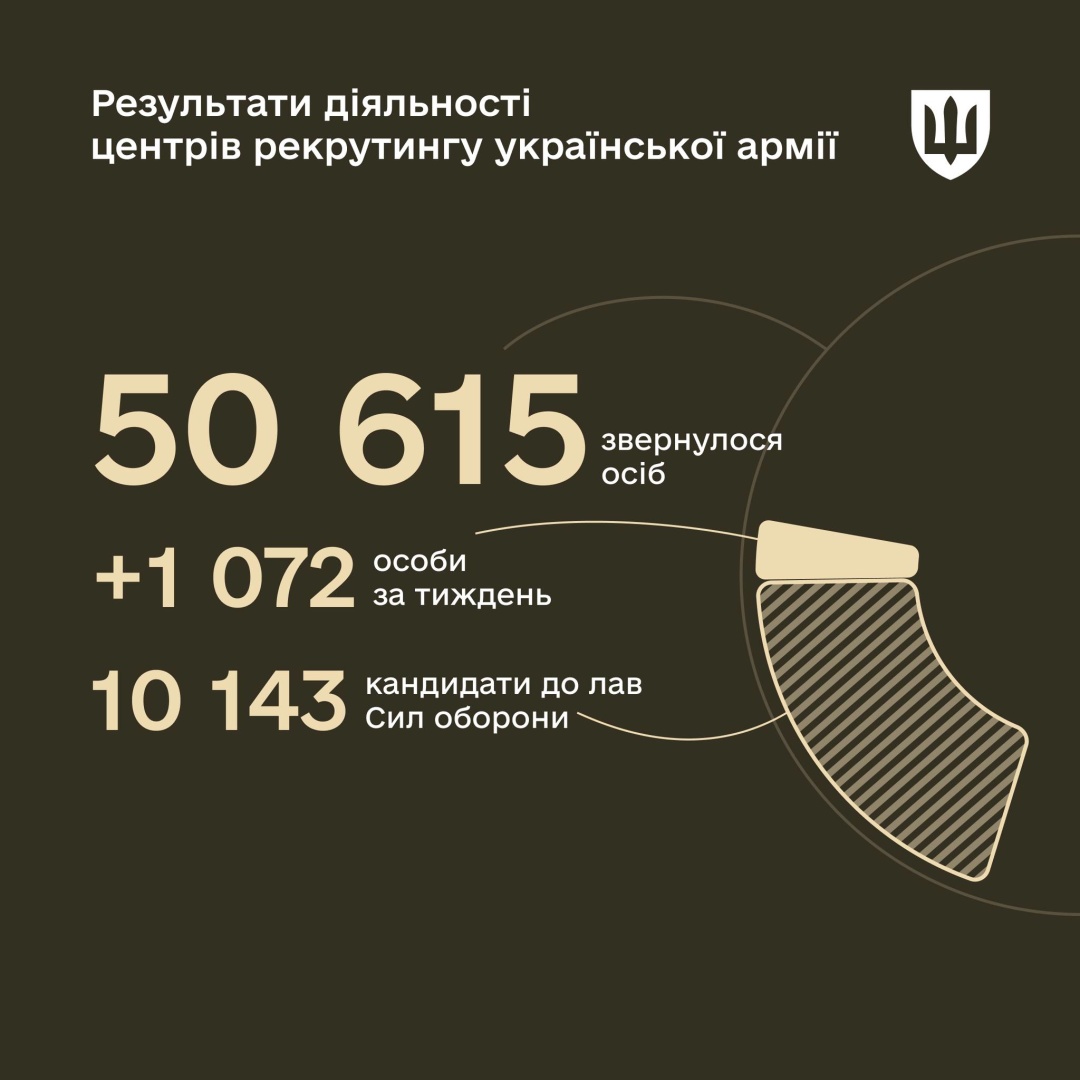Зазначається, що загальна кількість звернень до центрів рекрутингу вже сягнула 50 615. Минулого тижня було надано 1 072 консультації.
