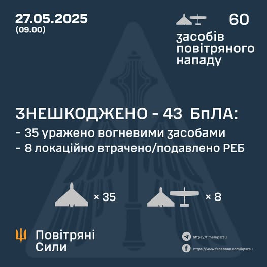 Станом на 09.00 протиповітряною обороною знешкоджено 43 ворожих БпЛА типу Shahed (безпілотників інших типів) на сході, півночі та півдні країни. 35 — збито вогневими засобами ураження. Ще 8 — локаційно втрачені (без негативних наслідків).