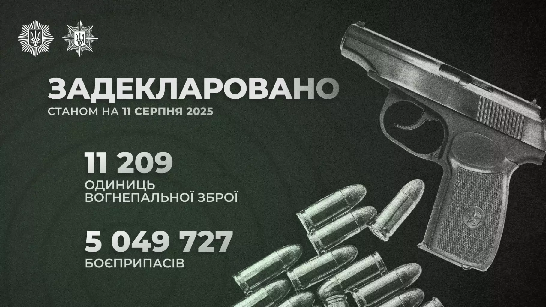 Станом на 12 серпня в Україні громадяни задекларували 11 209 одиниць вогнепальної зброї та понад 5 мільйонів боєприпасів