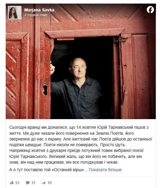 "Великий жаль, що він не побачить цю книжку, але він усе знав і погоджував. Ми дуже чекали його звернення до нас з екрану, але життєвий час Поета дійшов до останньої поділки швидше", – написала Савка.