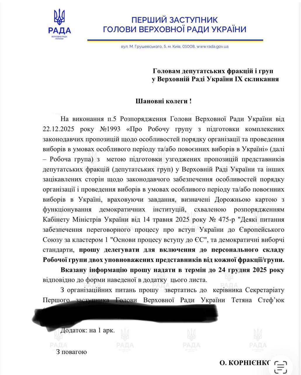 За його словами, на фракції та групи Ради прийшло запрошення від керівника партії "Слуга народу" Олександра Корнієнка надати по 2 представника в робочу групу щодо законодавчого забезпечення особливостей порядку організації і проведення виборів в умовах особливого періоду та/або повоєнних виборів в Україні.