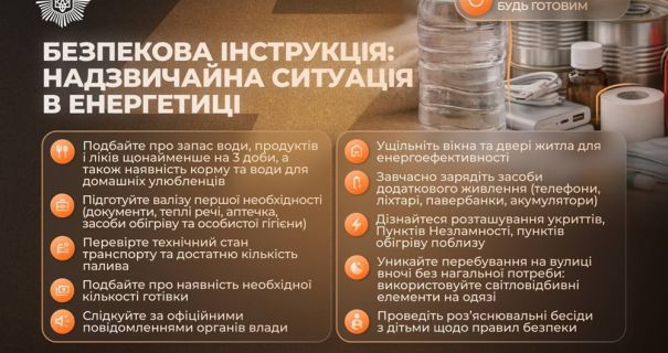 Міністерство внутрішніх справ закликає українців заздалегідь підготуватися до можливих надзвичайних ситуацій у сфері енергетики та безпеки. Громадянам рекомендують зробити запаси води, продуктів харчування та ліків щонайменше на 3–5 діб. Особливу увагу радять приділити домашнім улюбленцям, забезпечивши їх водою та кормом.