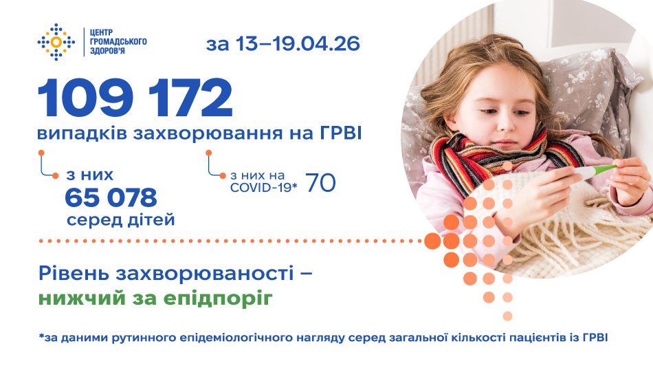 Водночас загалом в Україні за цей період зафіксовано 109 172 випадки гострих респіраторних вірусних інфекцій (ГРВІ), серед яких понад 44 тисячі дорослих і понад 65 тисяч дітей.