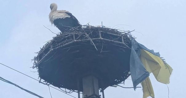 Зазвичай лелеки приносять для облаштування своїх осель гілки, траву чи клаптики тканини. Проте цього разу птах вразив усіх: у його дзьобі замайорів синьо-жовтий стяг. Лелека обережно вклав прапор у гніздо.