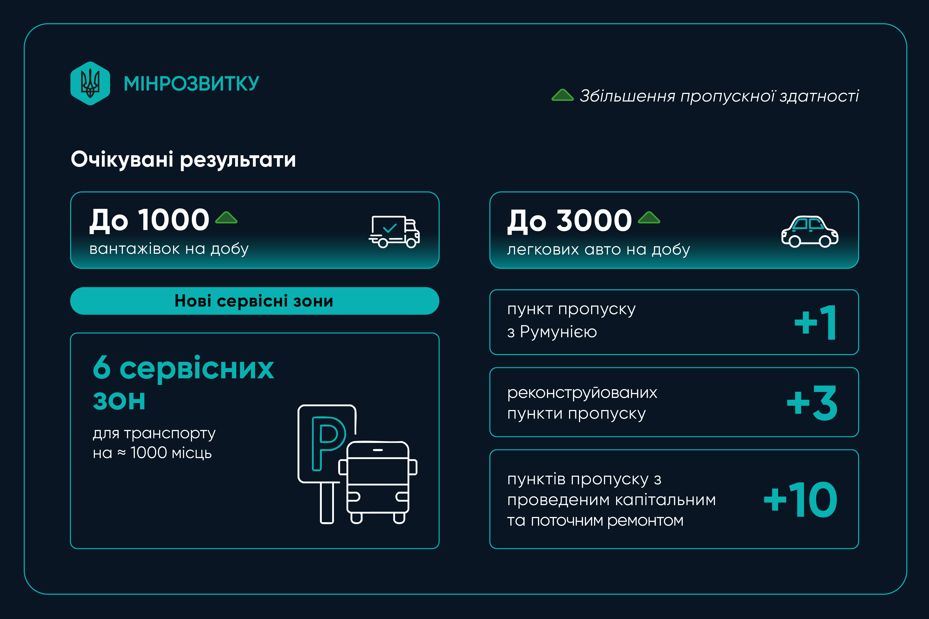 Модернізація пунктів пропуску покликана забезпечити швидший та зручніший рух через кордон, підвищити пропускну здатність і покращити сервіс для пасажирів та вантажного транспорту, наголосили в Мінрозвитку.