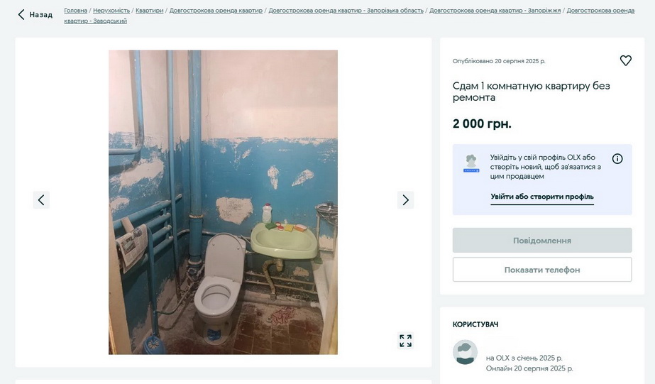 А що на OLX? Найдешевше, що тут пропонують, — це квартира в Заводському районі за 2 тисячі гривень на першому поверсі. Без ремонту, техніки, майже без меблів, за 500 метрів до найближчої зупинки.