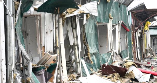 Внаслідок удару пошкоджені торгівельні ряди, магазини, багатоповерхівки.